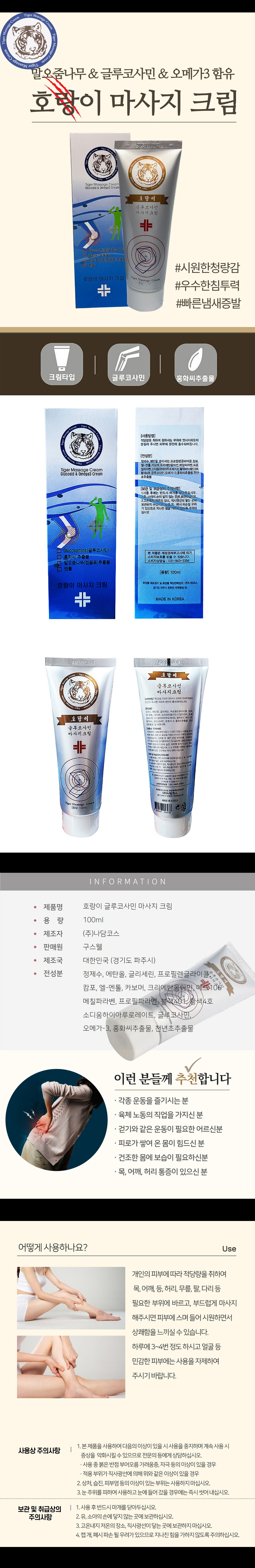 호랑이 마사지크림 글루코사민 피로완화 마사지젤 근육통 완화 크림 100ml 저자극