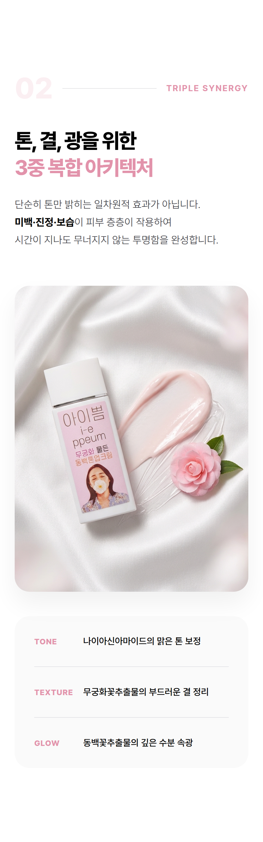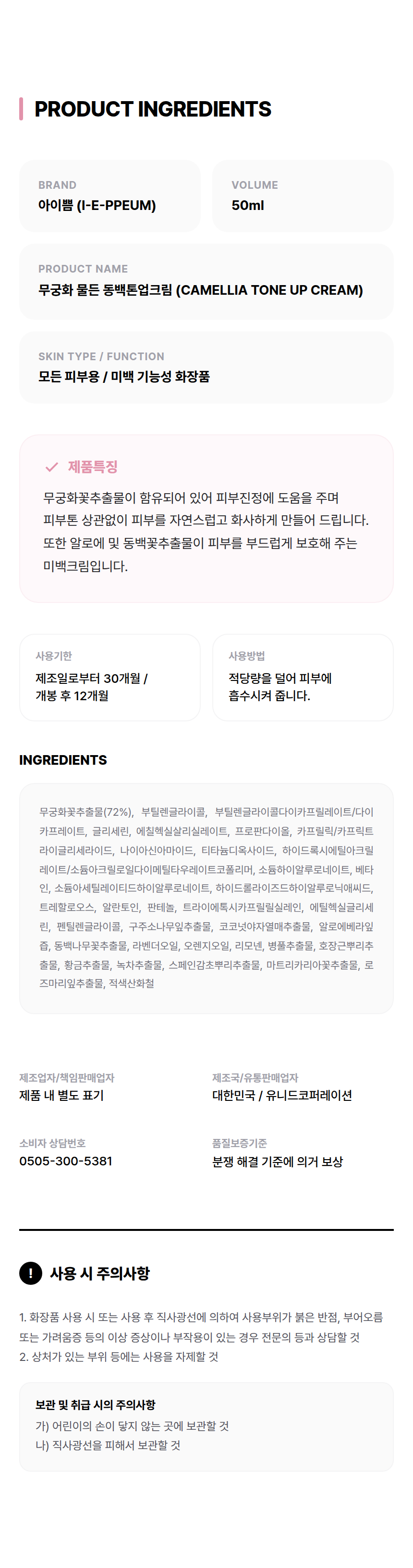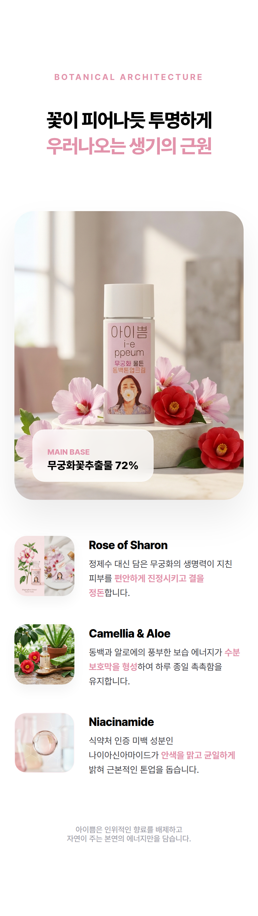 무궁화꽃추출물이 함유되어 있어 피부진정에 도움을 주며 피부톤 상관없이 피부를 자연스럽고 화사하게 만들어 드립니다. 또한 알로에 및 동백꽃추출물이 피부를 부드럽게 보호해주는 아이쁨 미백 기능성 톤업크림 입니다.