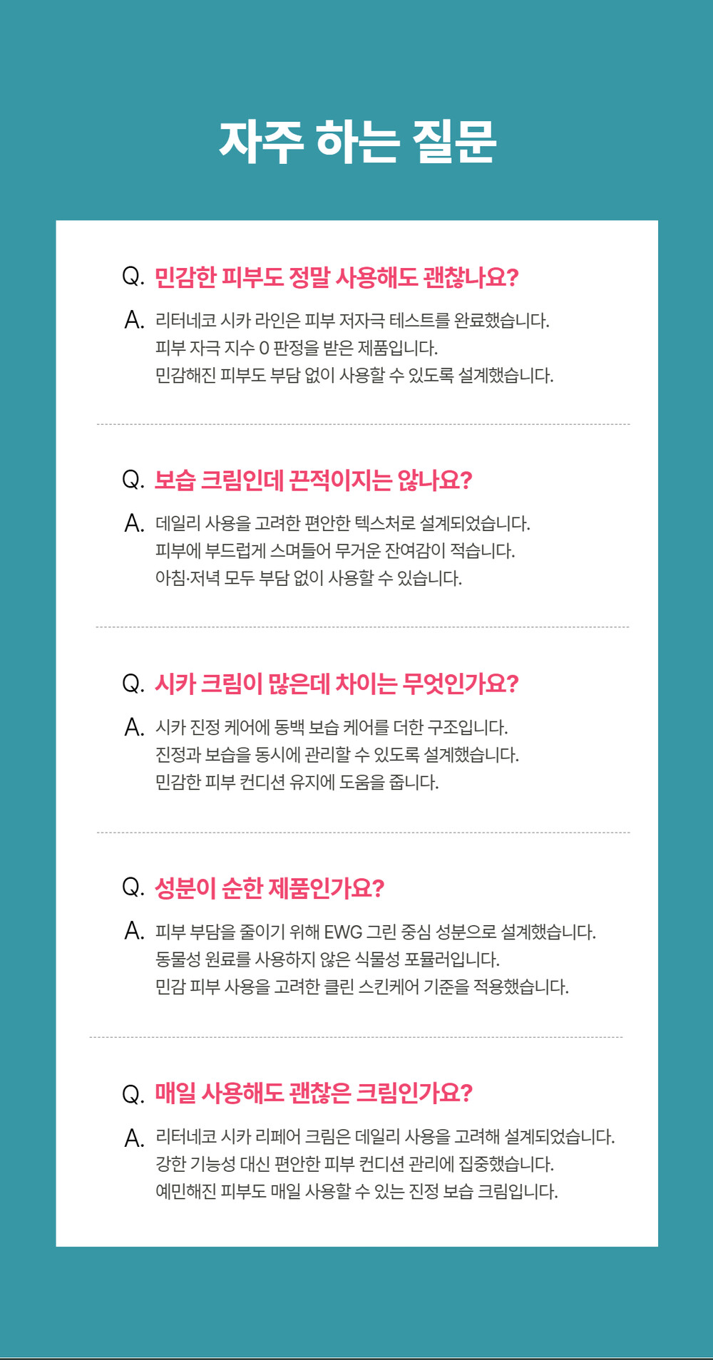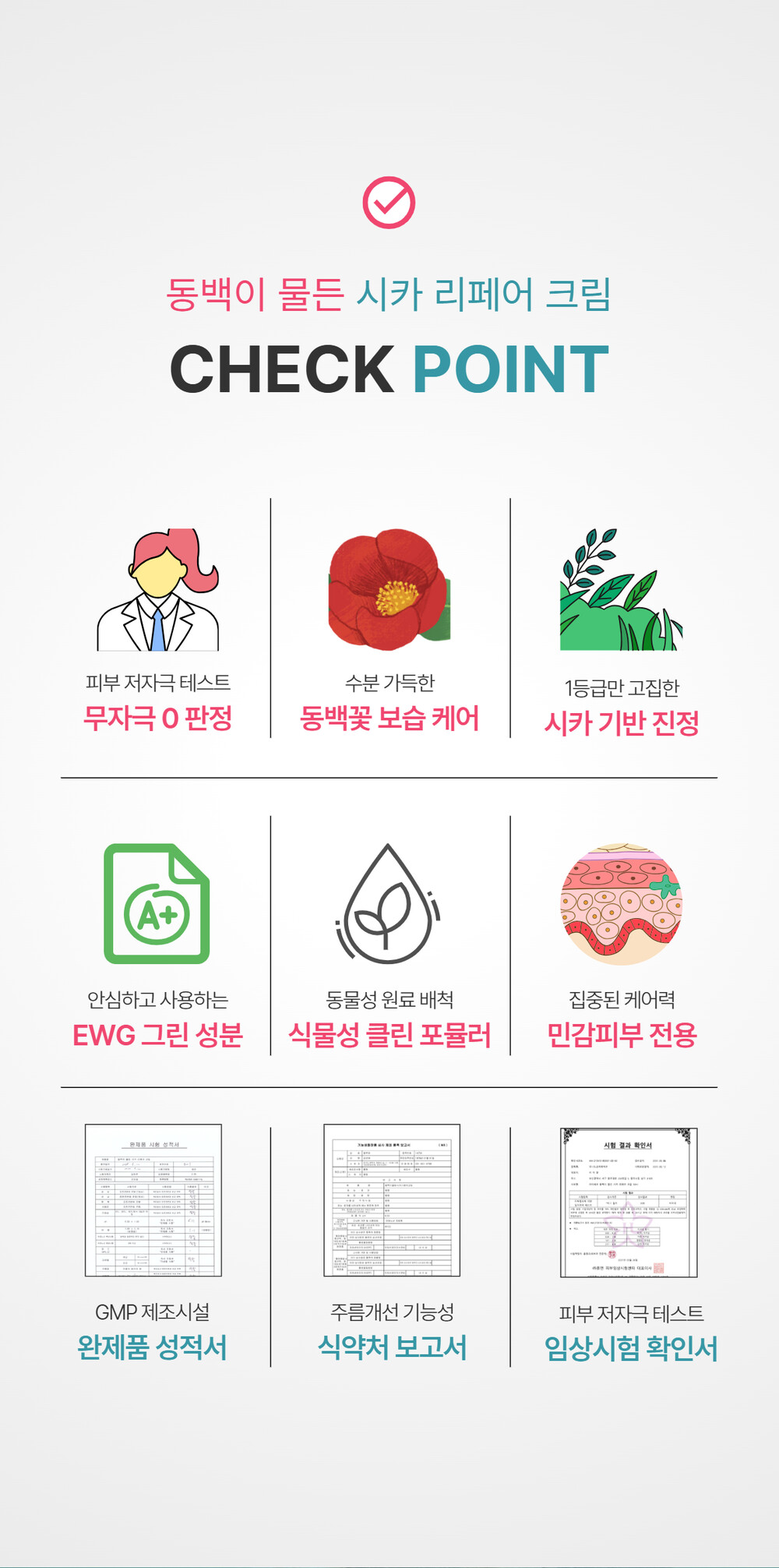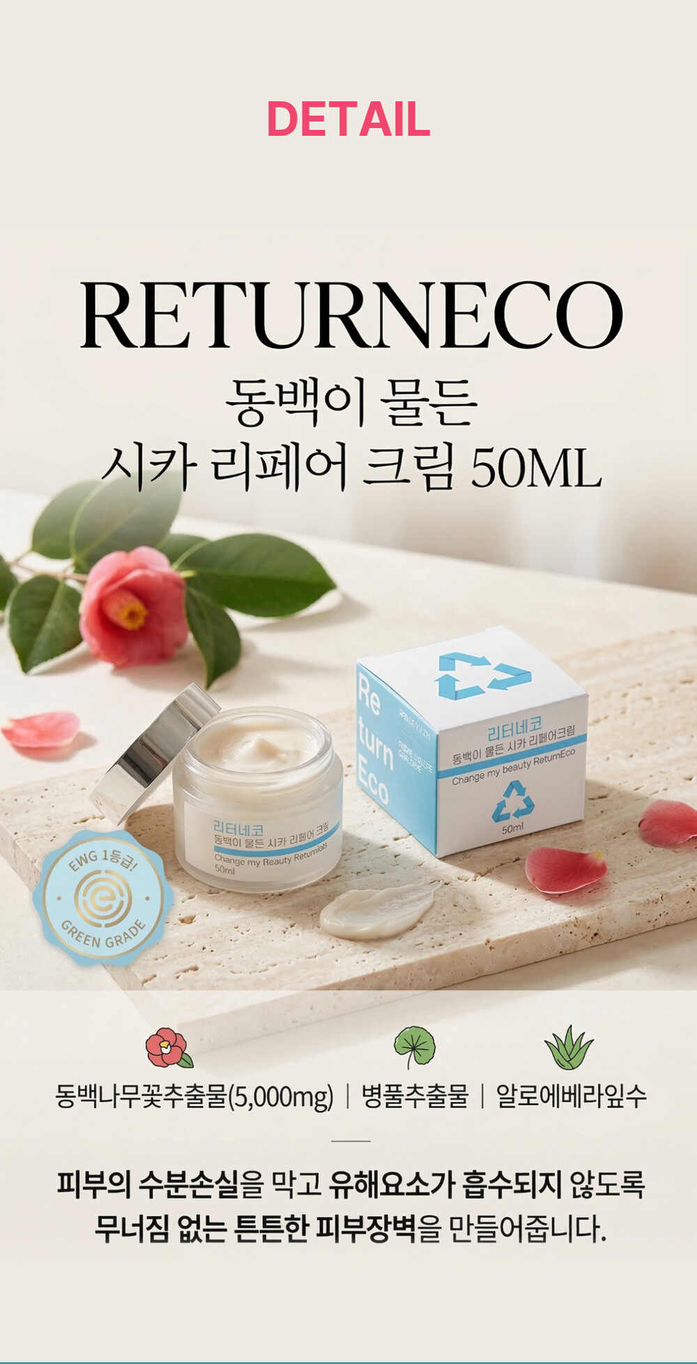 동백나무꽃추출물(5,000mg), 병풀추출물, 알로에베라잎수가 피부의 수분손실을 막고 유해요소가 흡수되지 않도록 무너짐 없는 튼튼한 피부장벽을 만들어주며, 주름개선 기능성 화장품으로 보습과 진정, 주름개선까지 한번에 올인원 케어가 가능합니다.