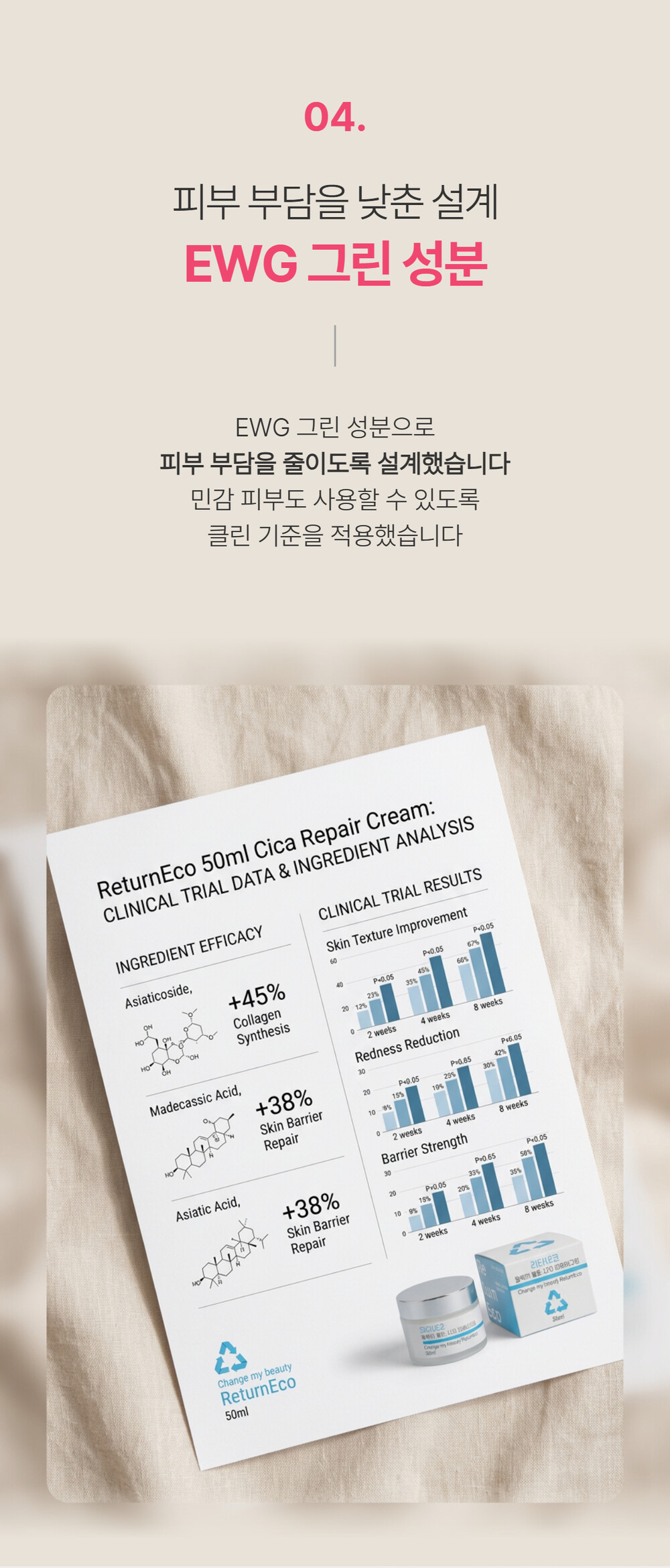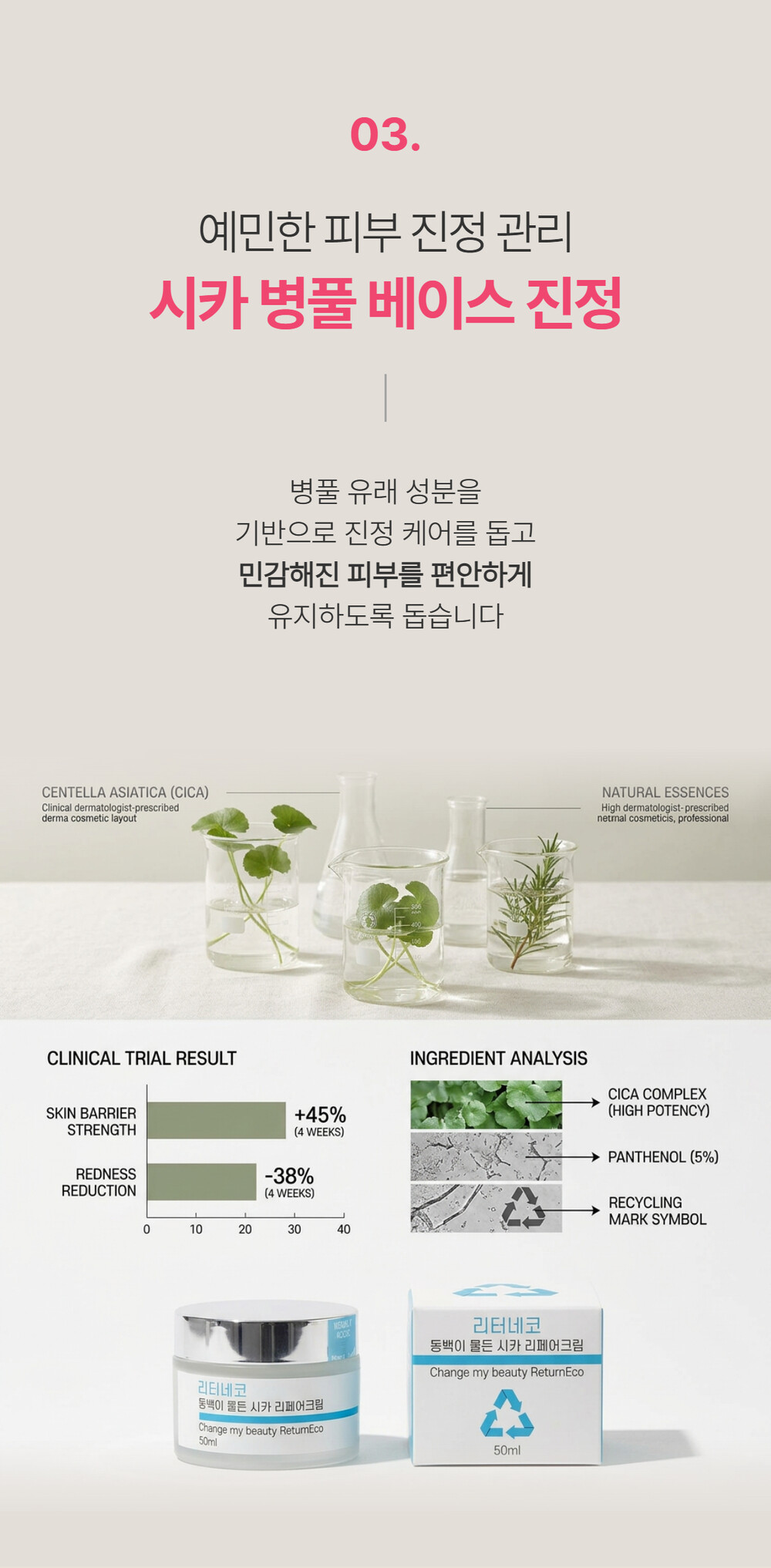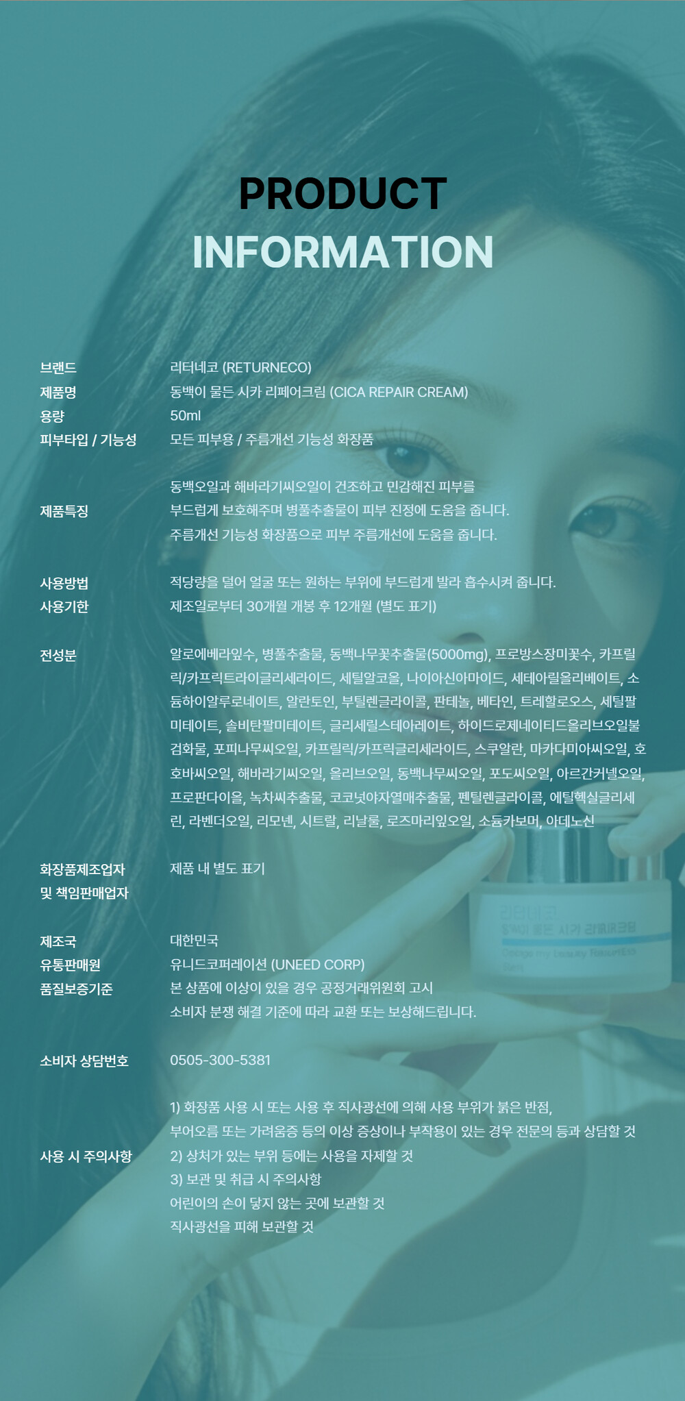 동백나무꽃추출물(5,000mg), 병풀추출물, 알로에베라잎수가 피부의 수분손실을 막고 유해요소가 흡수되지 않도록 무너짐 없는 튼튼한 피부장벽을 만들어주며, 주름개선 기능성 화장품으로 보습과 진정, 주름개선까지 한번에 올인원 케어가 가능합니다.